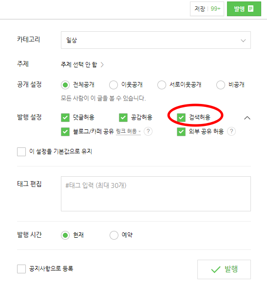1) 글을 발행할 때, '검색 허용'을 클릭했는지 확인합니다.