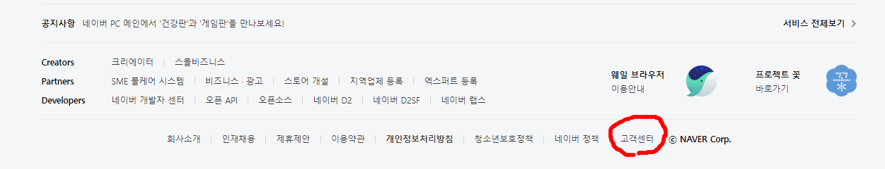 1) 네이버 사이트에서 하단에 보면 [고객센터]가 있습니다.