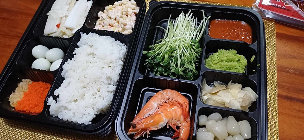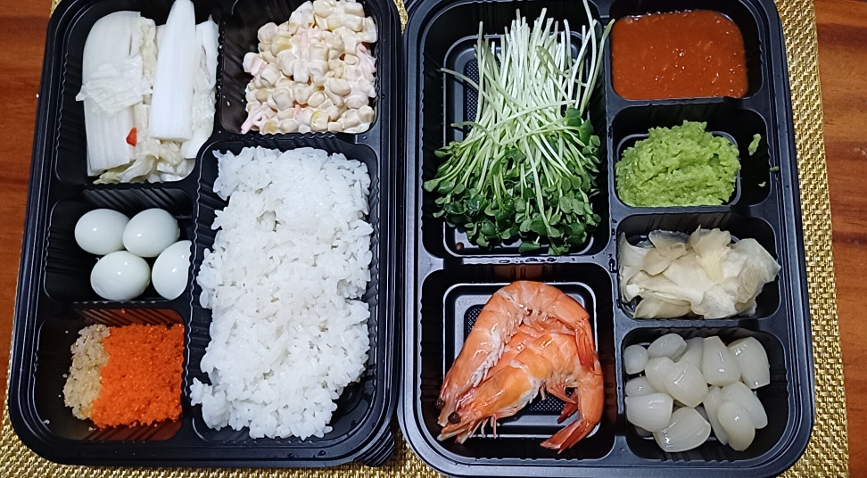 새우, 메추리알, 날치알, 새콤달콤 양념 밥, 마요네즈 콘, 백김치, 무순, 락교, 생강 절임, 생와사비..
