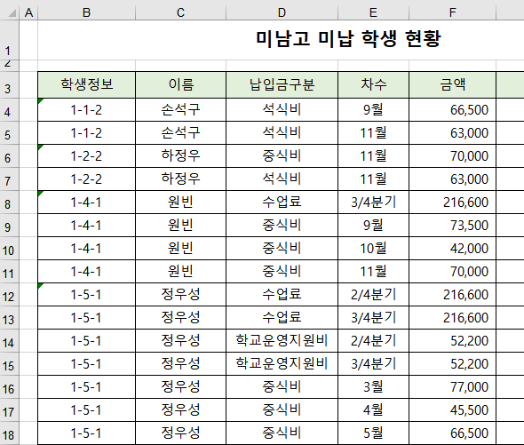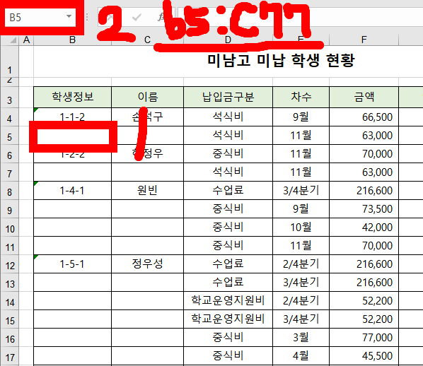 5) 학생정보와 이름을 모두 선택하고, (B4~C4 드래그 > Ctrl+Shift+아래방향 화살표)