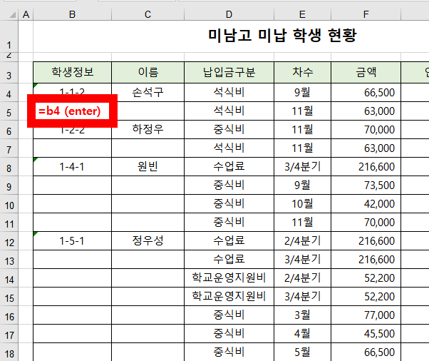 '=b4'를 적고, enter를 누르면, b4의 데이터가 b5에 적힙니다.