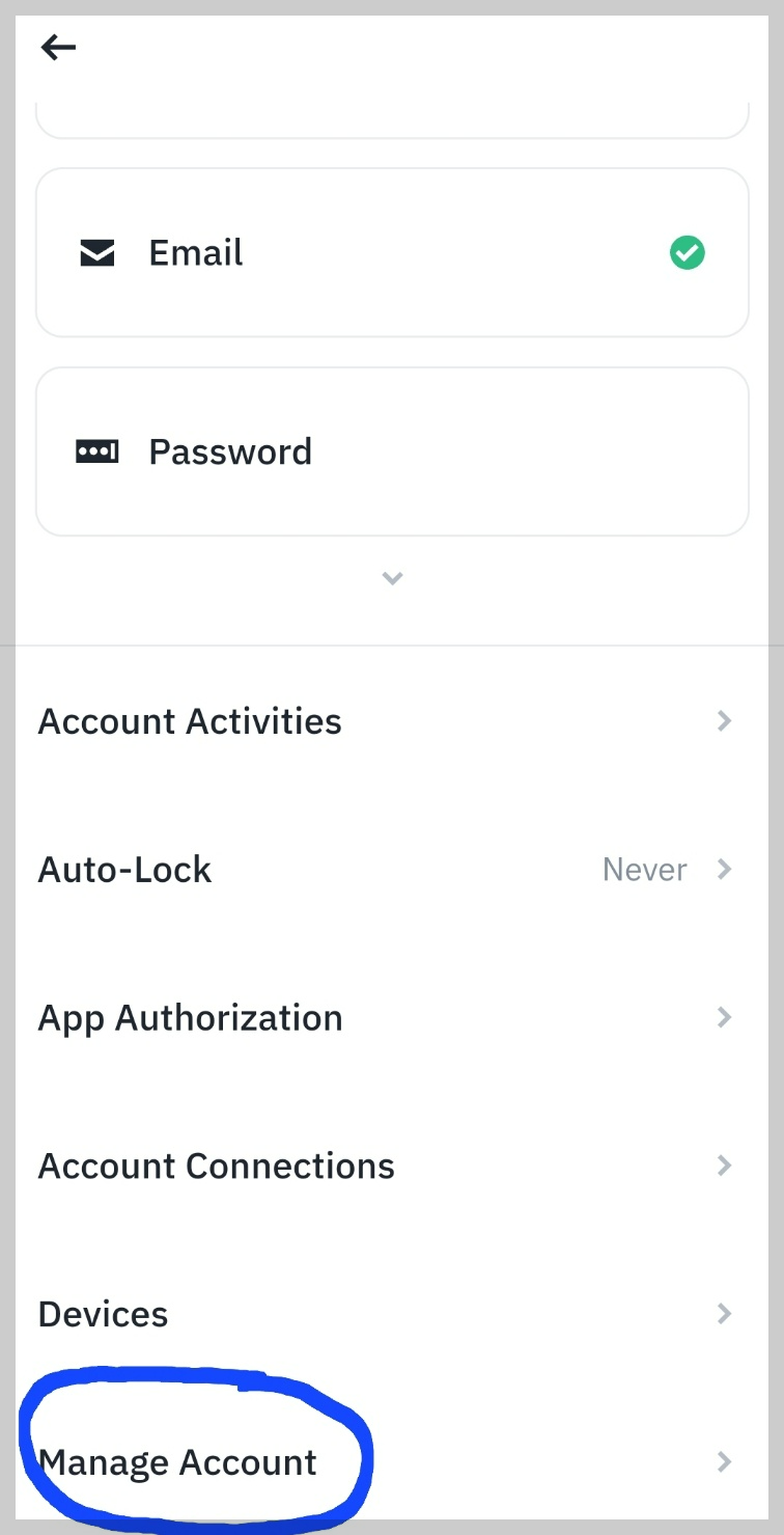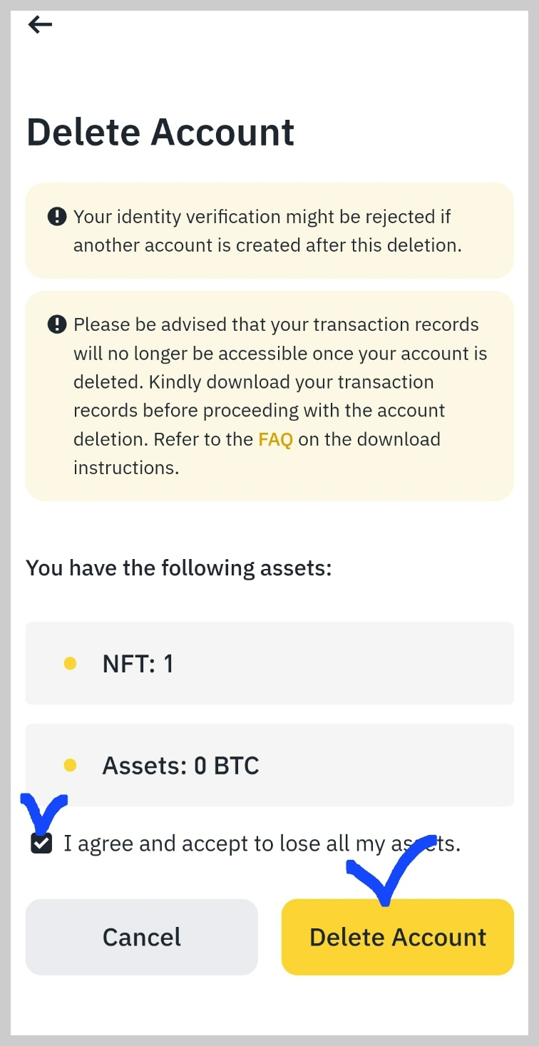 ② Delete Account 창에서 'I agree and accept to lose all my assets.' 체크 > Delete Account 클릭