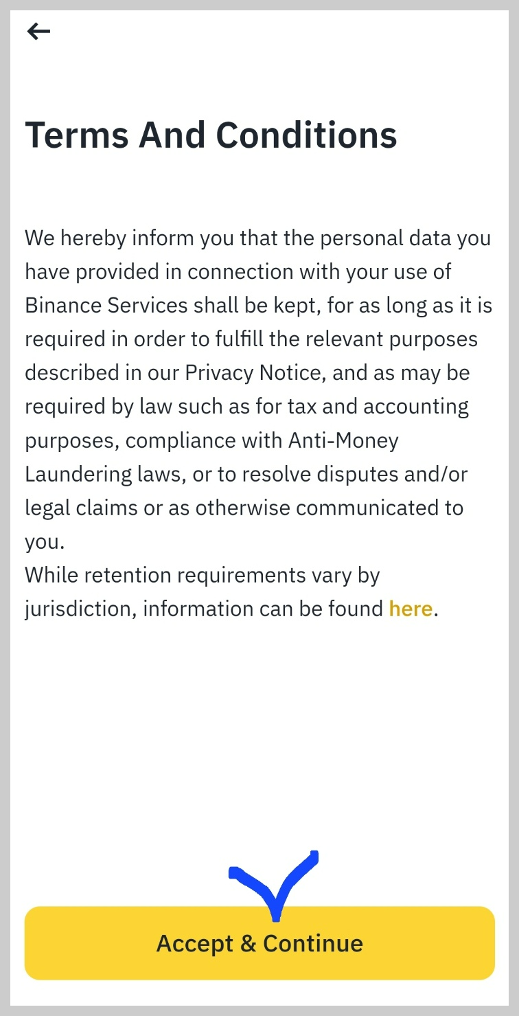 ① 내용 '바이낸스에 제공한 개인데이터는 개인정보보호 목적을 위해 보관된다.' > Accept & Continue 클릭