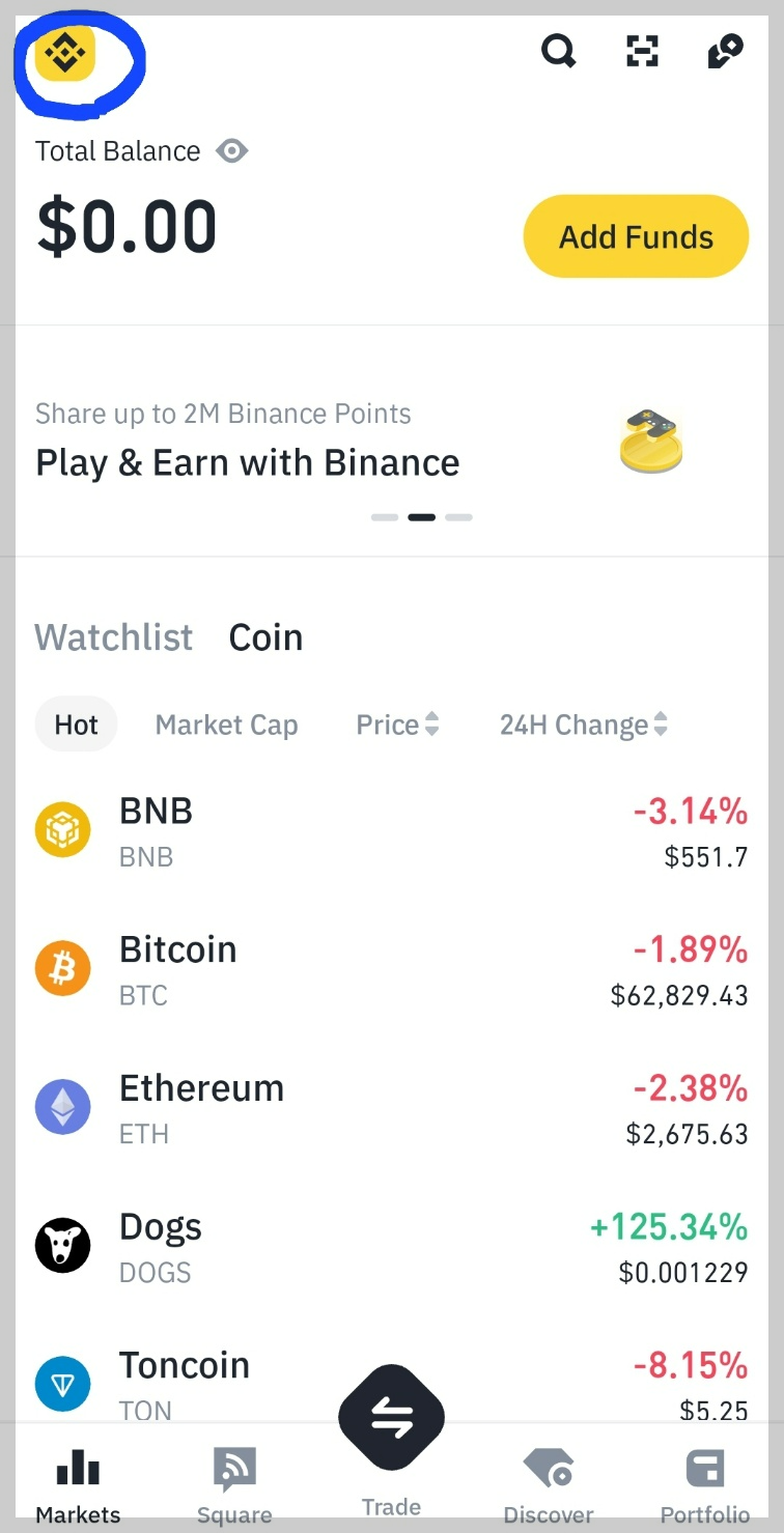 ① 첫 화면에서 왼쪽 상단의 바이낸스 마크 클릭