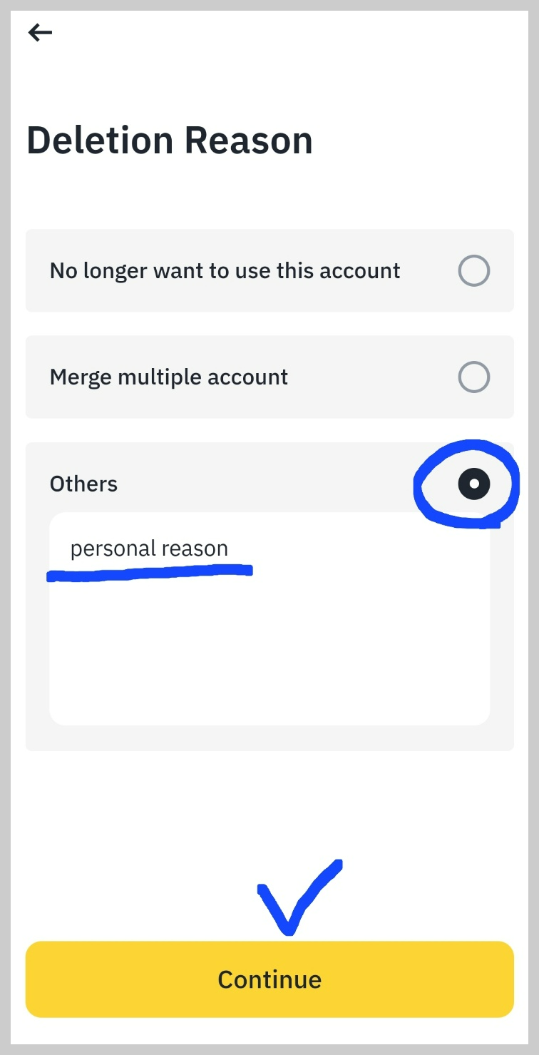 ③ personal reason(개인적인 사유) 적고 하단의 Continue 클릭