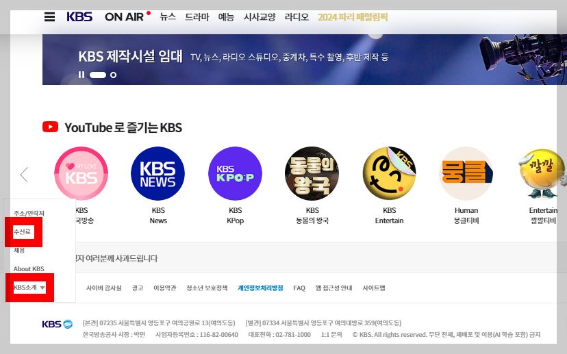 2)홈페이지 하단 'KBS소개' 클릭 》