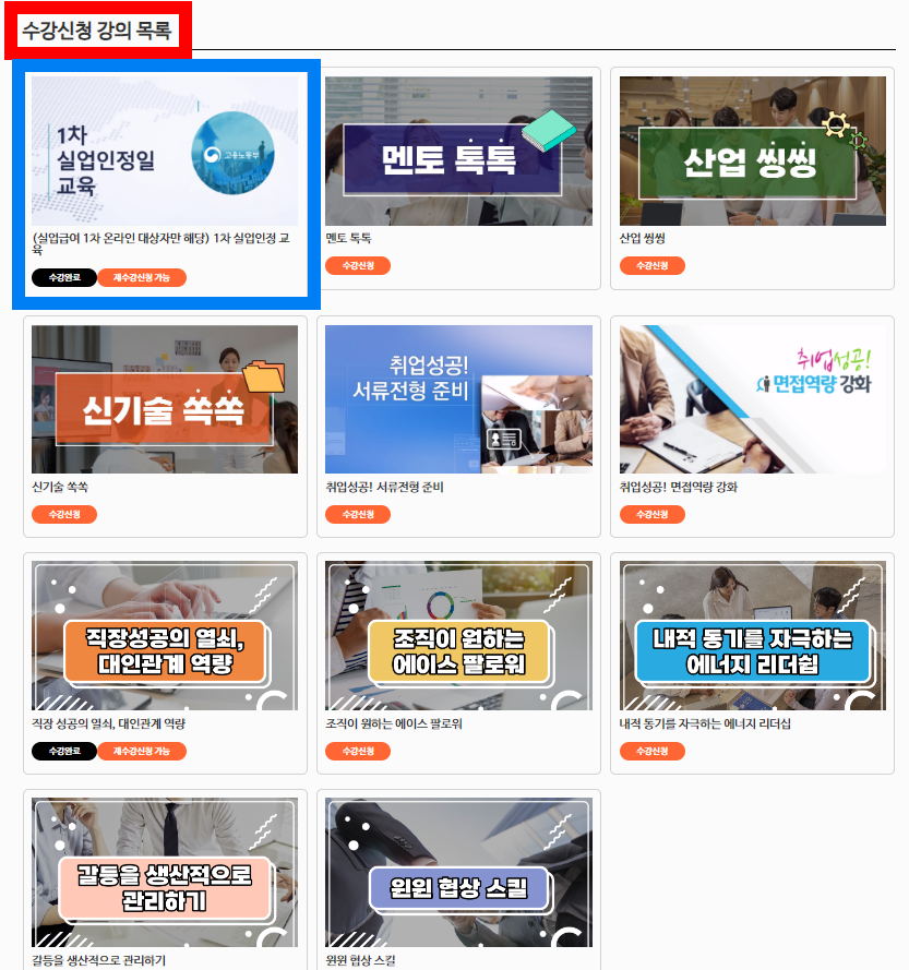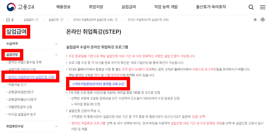 고용24 > 실업급여 > 실업인정 > 온라인 취업특강(1차 실업인정 교육)