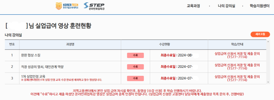 본인의 실업급여 영상 훈련현황 > 나의 강의실에