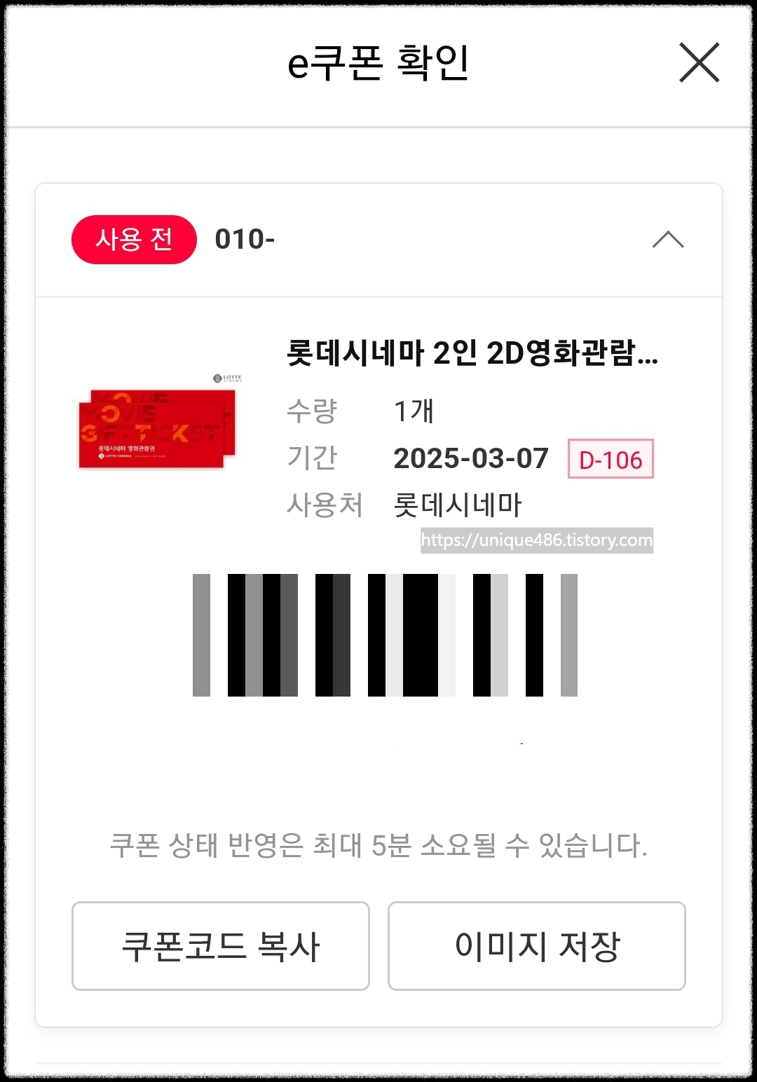 e쿠폰 목록에서 내가 구입한 영화관람권의