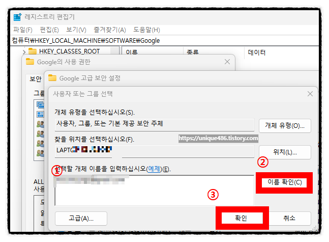 윈도우 사용자 계정을 입력 후 [이름 확인] 버튼을 클릭한 후 개체 이름이 완성되면 [확인] 버튼을 클릭합니다.