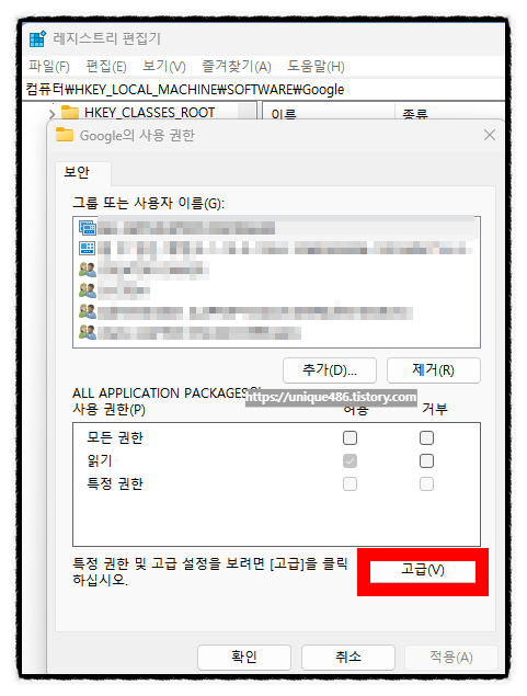 Google의 사용권한 창에서 [고급] 버튼을 클릭합니다.