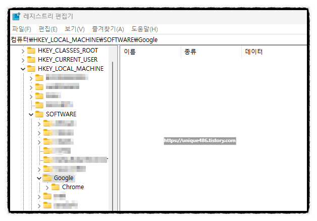 ④ 컴퓨터 > HKEY_LOCAL_MACHINE > SOFTWARE > Google 폴더를 마우스로 우클릭하여 [삭제]를 클릭합니다.