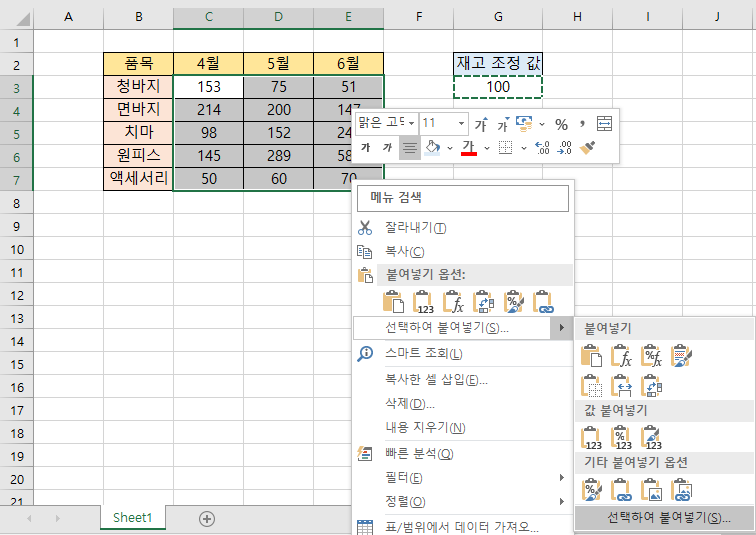 [C3:E7] 을 드래그하여 지정한 후 마우스 오른쪽 버튼을 클릭 > [선택하여 붙여넣기] 클릭