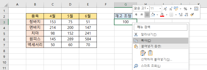 [G3] 셀을 클릭하고 [복사] 클릭